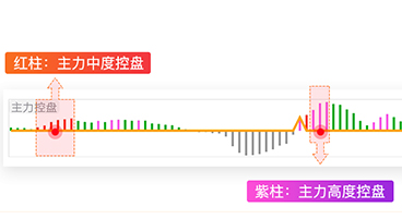 水平基线上方红色柱表示“主力中度控盘”,紫色柱表示“主力高度控盘”,绿色柱表示“控盘减弱”,水平基线下方灰色柱表示无主力控盘。